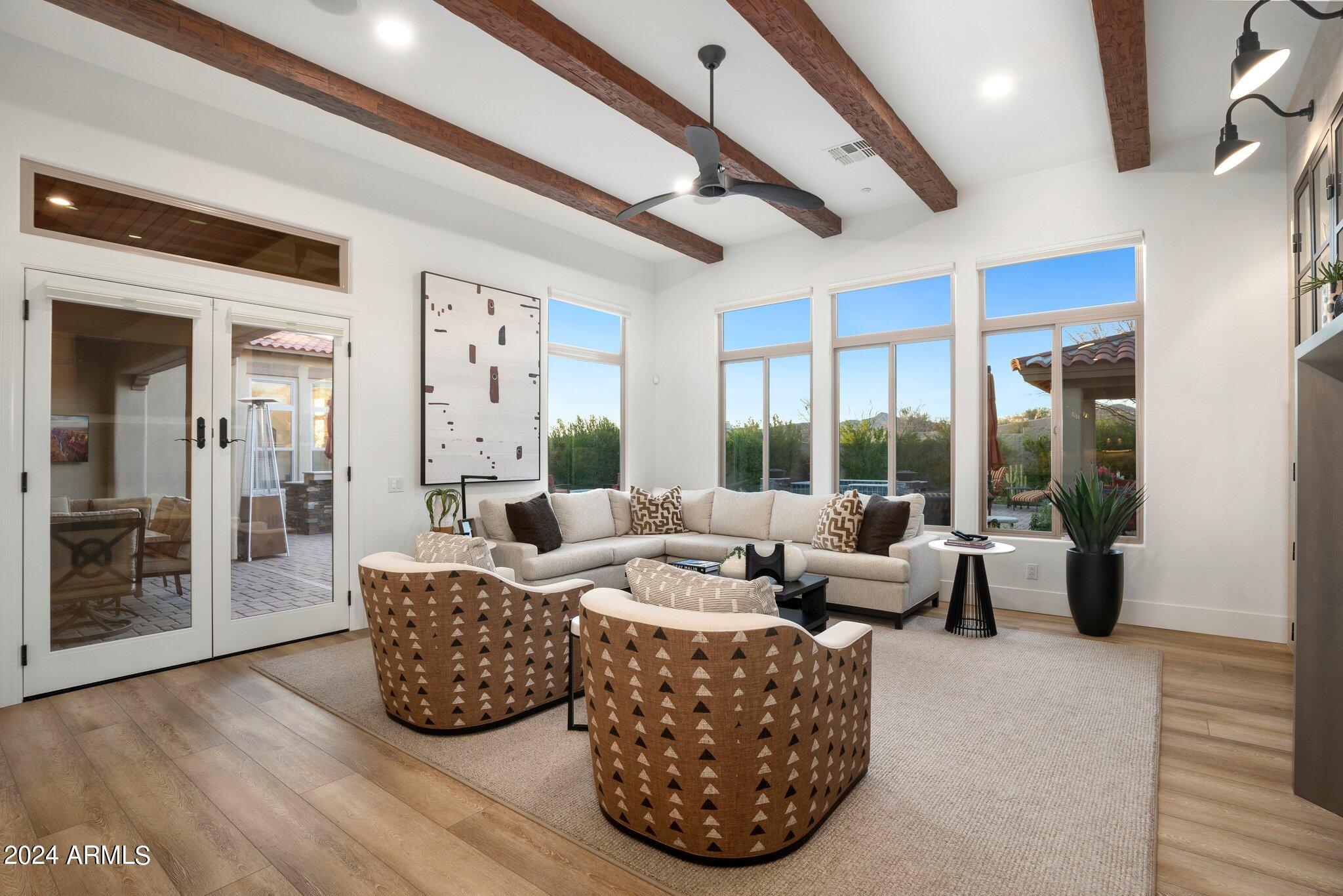 Welcome to luxury living nestled in the gated community of Monterey at Mirabel Village. This single-level residence, sprawling 4,399 SF, has been meticulously remodeled to offer a modern and elegant interior that exudes organic contemporary. Situated on a serene cul-de-sac lot, the property delivers mountain views and a private courtyard, featuring a fireplace and sitting area.